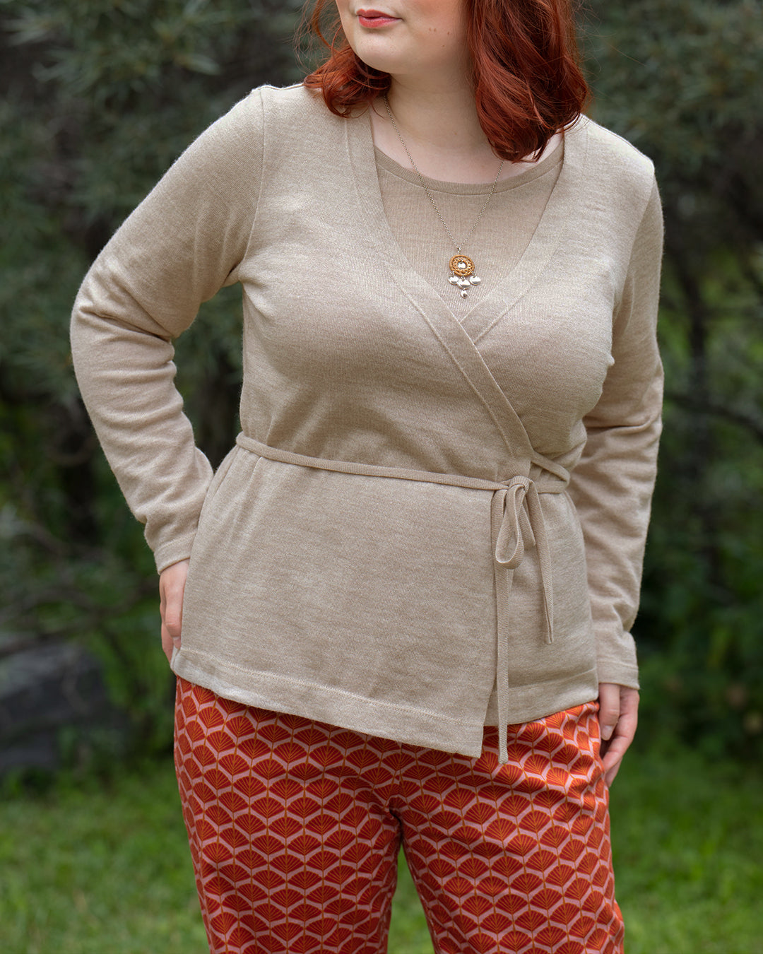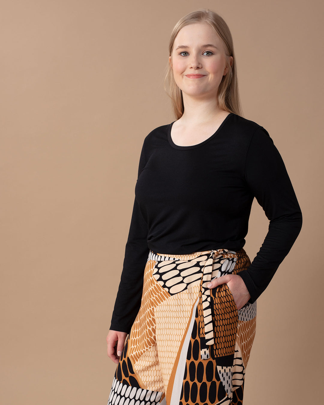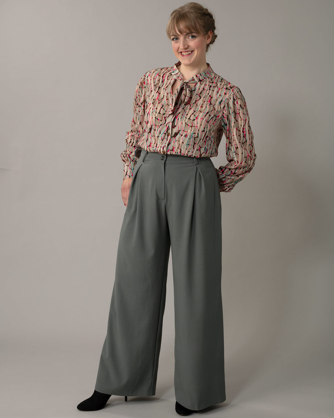 Un bonito vestido de pana, una blusa con lazada en el cuello y un precioso pantalón de crep de viscosa. Un vestido de punto de gofre con pliegues en las mangas y uno de punto estampado. Pantalones tobilleros de raso de algodón y un conjunto de camiseta y cárdigan de tricot de lana merino ligero y cálido. Un vestido otoñal en tela de viscosa de flores. Tallas: 34-48/52.