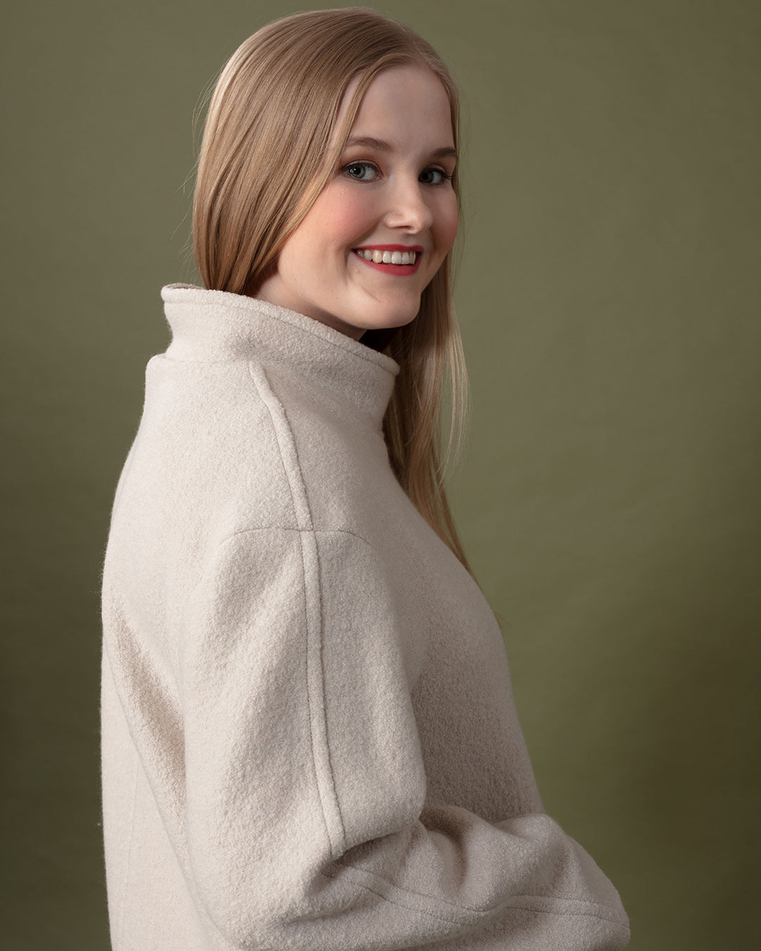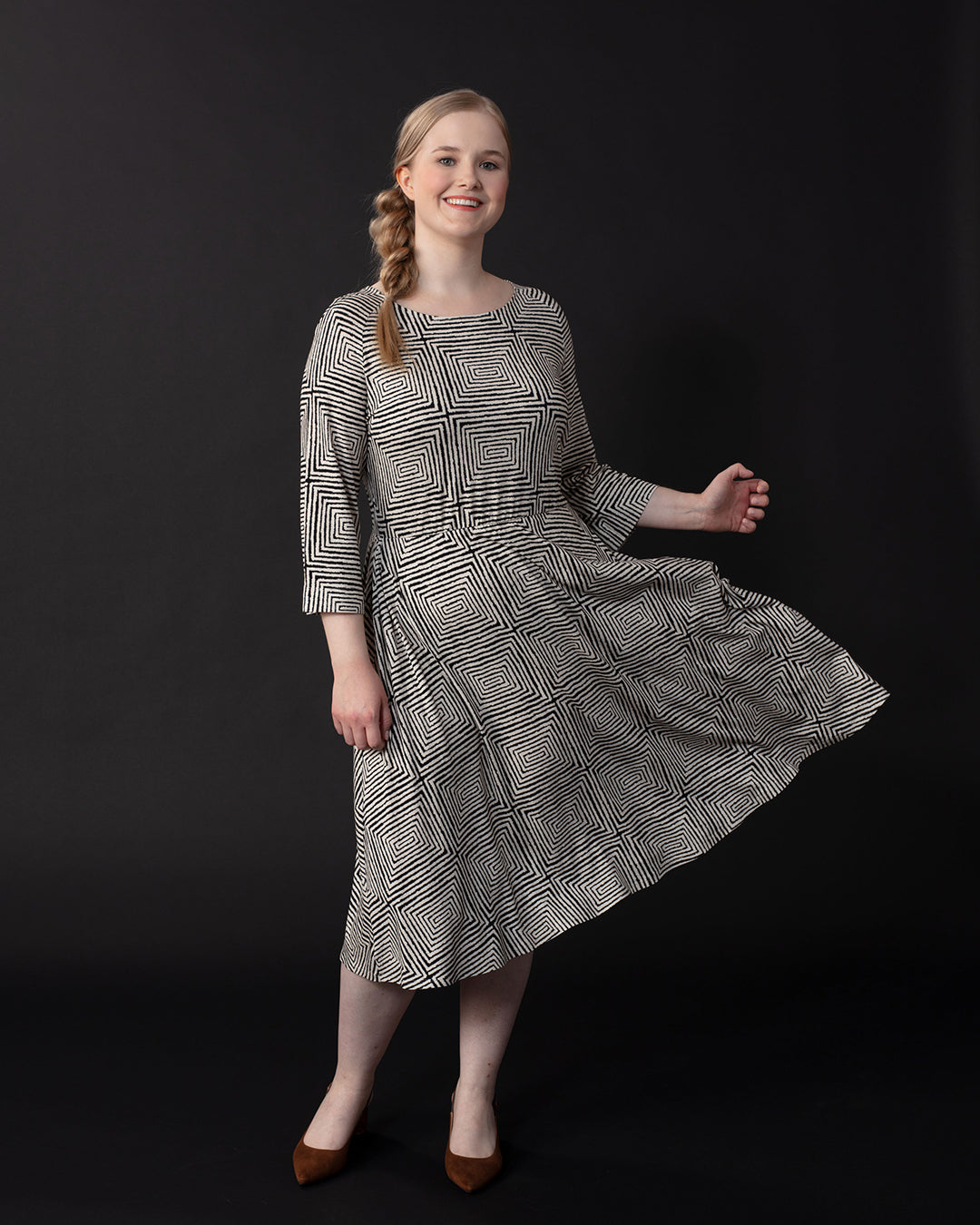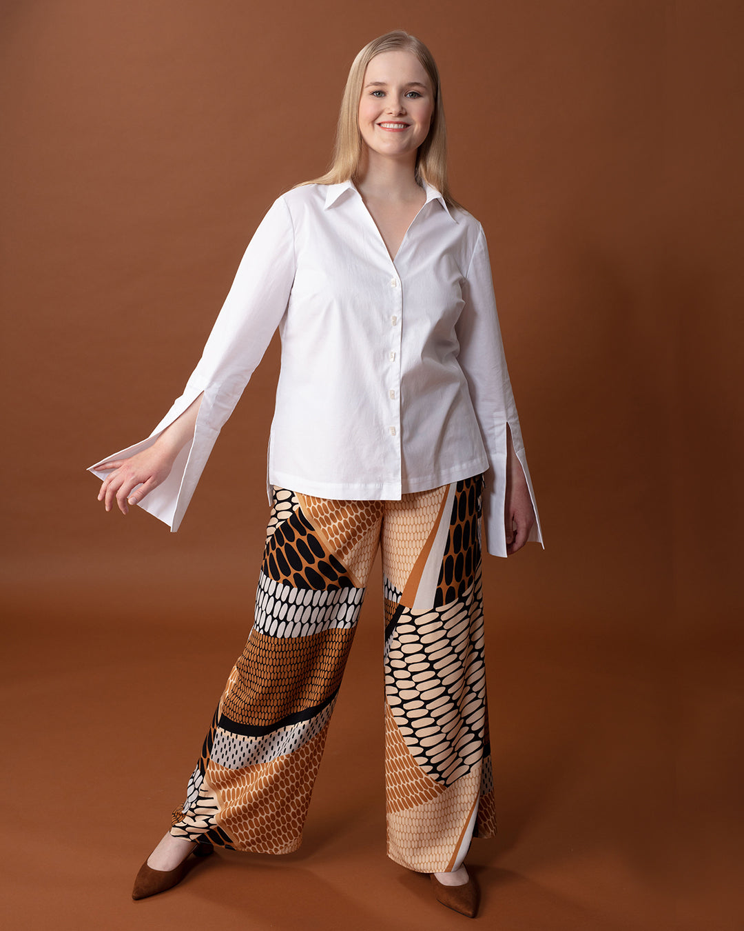 Una preciosa colección cápsula para mujeres modernas. Un conjunto de pantalón y chaqueta de viscosa, una camiseta de punto de soja y una camisa blanca clásica. Un vestido de estampado geométrico y un vestidito negro para ocasiones especiales. Una fabulosa chaqueta de lana merino hervida y un elegante vestido de tricot de lana. Tallas: 34-52.